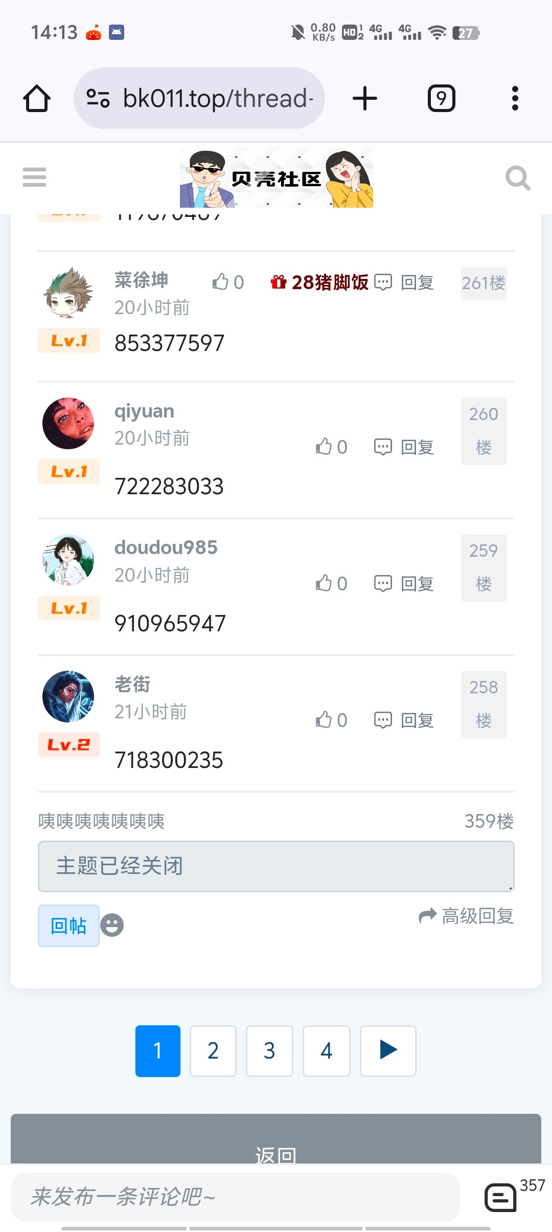 比我强,我的评论359楼,看开奖后,直接帖子已关闭。
