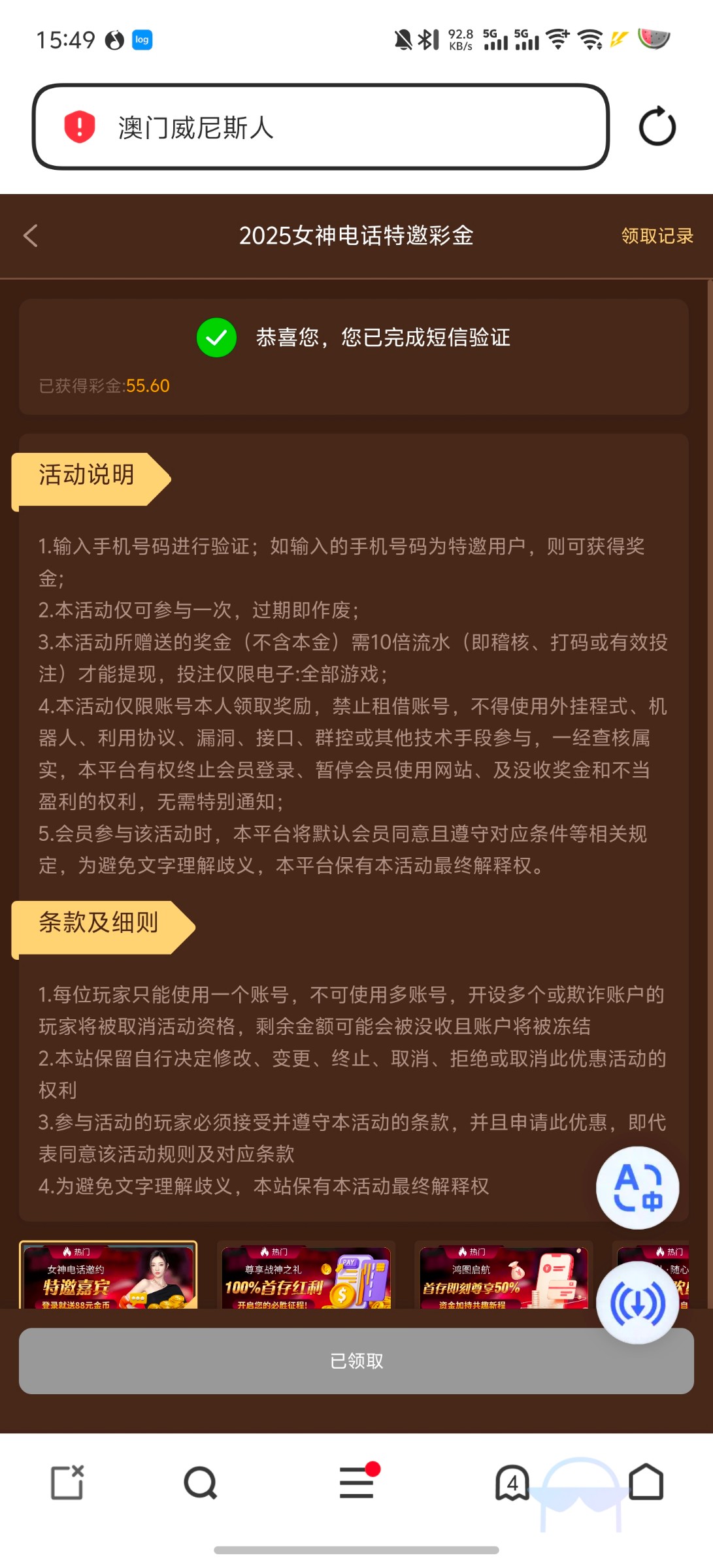 56v.com. 发完帖子后找客服申请特邀彩金