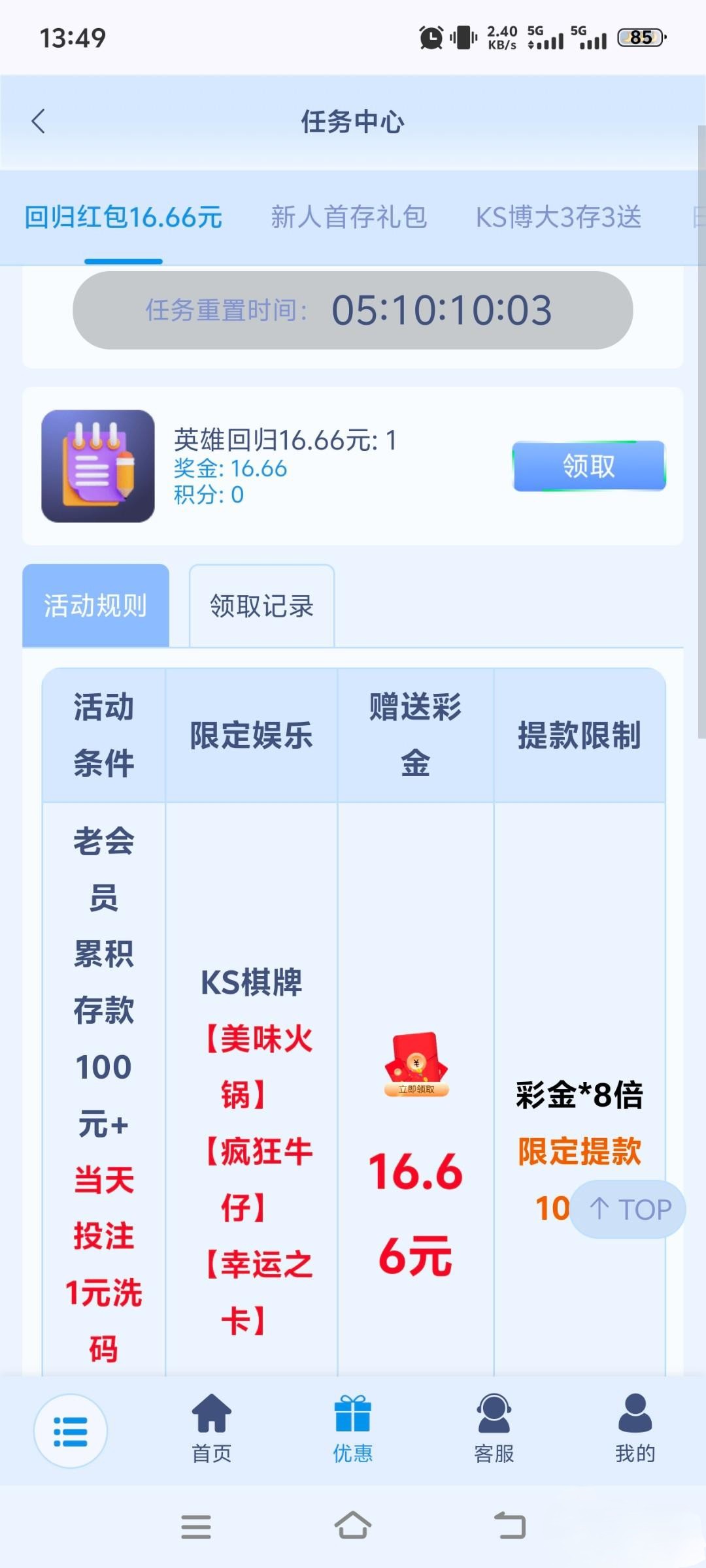英雄回归彩金刷新了,可以重新领取